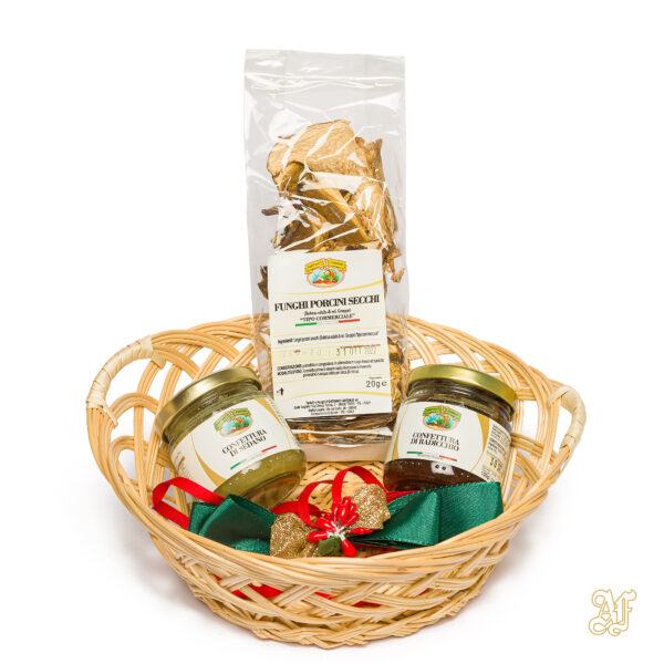 Il cesto è un’idea regalo perfetta per tutti i palati Gourmet e contiene: Porcini essiccati, Confettura al radicchio e confettura al sedano.