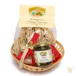 Il cesto è un’idea regalo perfetta per tutti i palati Gourmet e contiene: Strangozzi ai Porcini e Crema di Olive Nere.