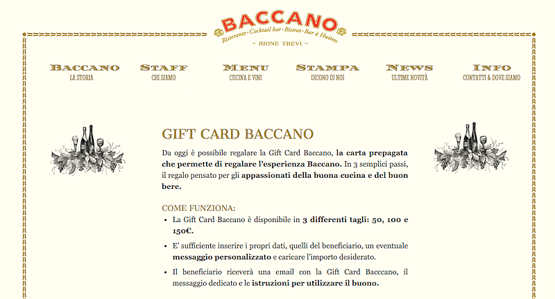 Questi sono solo alcuni esempi, perché ormai tantissimi sono i ristoranti che propongono Gift Card, come per esempio Baccano, a due passi da Fontana di Trevi, che ha una pagina dedicata dove basta inserire i dati propri e del beneficiario, ed il gioco è fatto; il destinatario riceverà direttamente una mail con le istruzioni per utilizzare il buono.