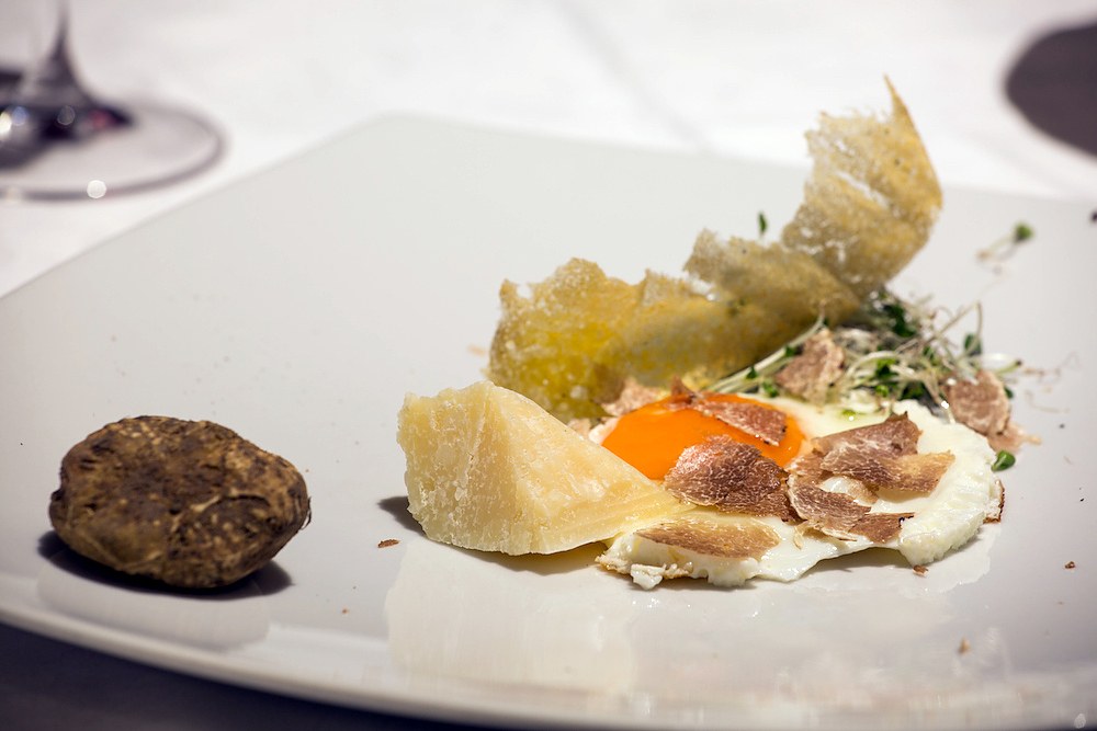 - Quando l'uovo è ancor caldo, mettervi sopra una noce di burro, scaglie di Parmigiano reggiano e fette di tartufo bianco.